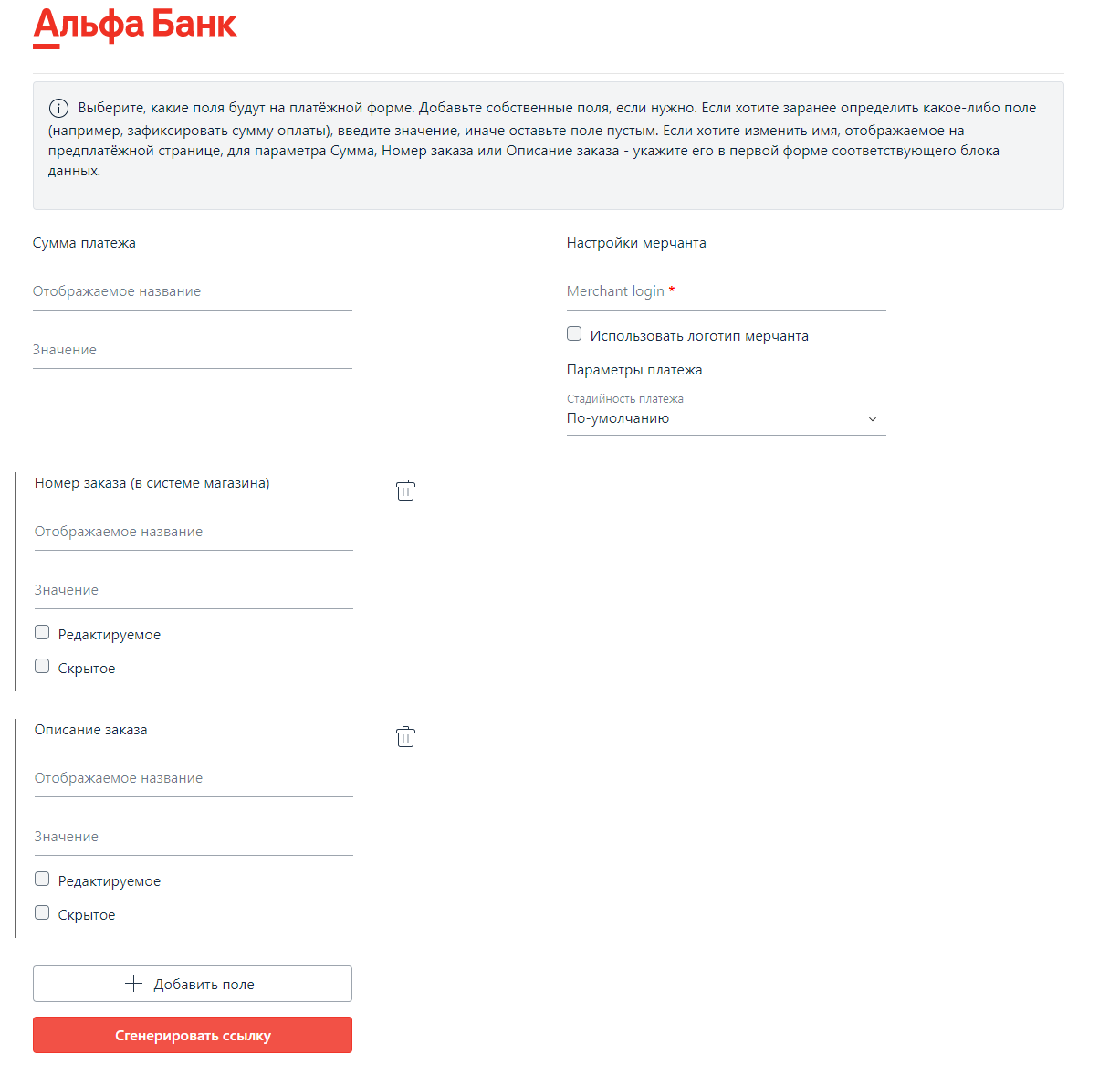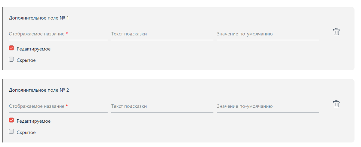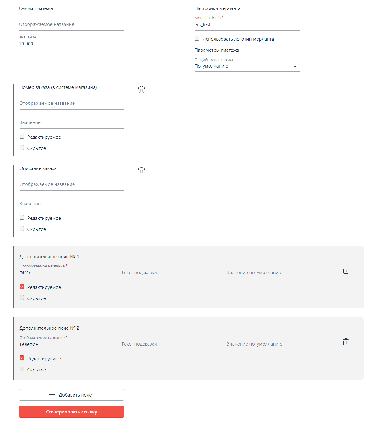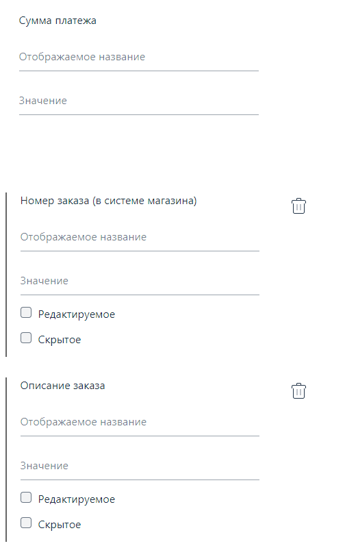 Редактируемое – если установлен данный чекбокс, то покупателю предлагается самостоятельно заполнить значение этого поля. Если чекбокс не установлен, то значение задается при настройке платежной формы и покупатель не может его изменить.